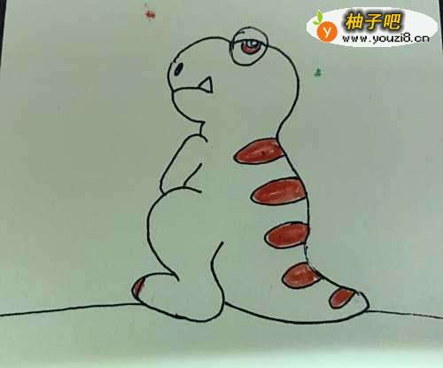 3用红色水彩笔绘制出背部的花纹,脚趾以及眼睛。