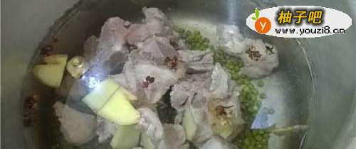 4将准备好的食材放入高压锅内,大火烧开,转小火20分钟(这样猪脊骨的营养都出来了,绿豆也变成绿豆沙了).