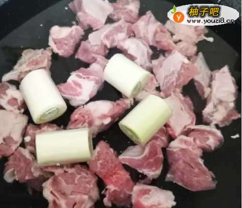 22. 锅中放入冷水、大葱段、适量料酒和牛腩一起飞水待用。准备好所有食材,以便随时取用。