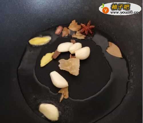 33. 锅烧热后转小火将冰糖、大料一起炒香至冰糖融化。加入一勺郫县豆瓣酱炒出红油。