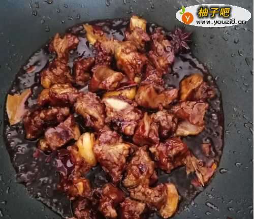 44. 加入牛腩继续小火翻炒均匀,尽量让每一块牛腩都上色。加入耗油、生抽、料酒继续翻炒。