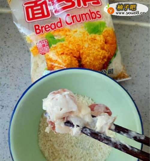 5用筷子夹起一团,不用追求形状,准备裹面包糠