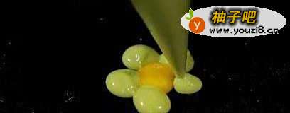 接着在蛋黄糊的四周,用菠菜糊继续挤5个均匀的圆圈,做成小花的形状。