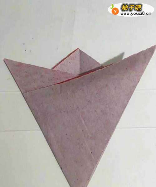 第一步 首先把一张16厘米X16厘米的正方形红色彩纸 从下向上对角折叠整齐