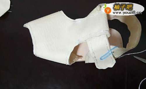 55、背带固定在鞋底两侧,使用回针法缝制,缝制0.5mm缝边即可。