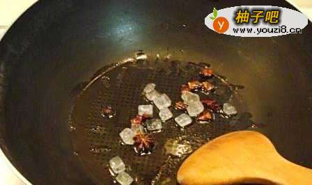 4所有材料准备就绪后,开始准备炒排骨。将锅调到合适的温度,加入适量的荤油,融化。加入备好的作料进行翻炒,炒出香味加入冰糖继续翻炒,直至冰糖融化,炒出颜色
