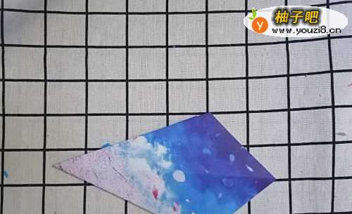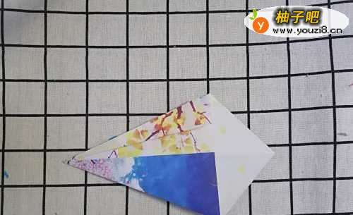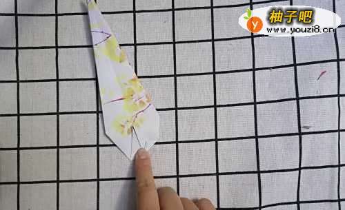 9尖尖得着一边向中心折痕折叠,不要折到头了。如图所示。