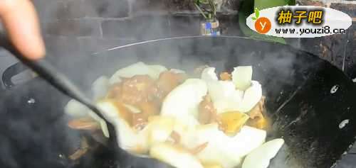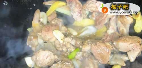 33.大火加热炒锅中的油至6 成热,投入姜片煸炒出香味,放入鸭块煸炒2分钟。
