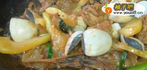 44.烹入料酒、酱油、柱候酱翻炒均匀,注入热水,加盖烧开,调成中火焖煮10 分钟。
