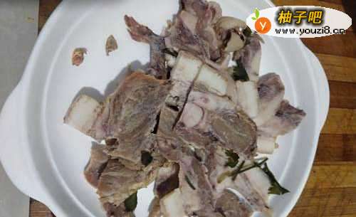 2如图,将新鲜的猪头肉切成均匀的薄片,我使用的是熟猪头肉哦。