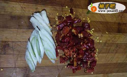 如图,首先取来适量干红椒和大葱,洗净后切好备用。