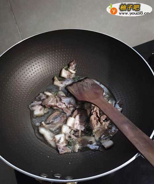5如图,将切好的猪头肉放进锅中翻炒两下。