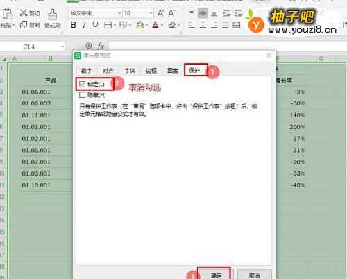 3在“单元格格式”窗口,选择【保护】选项卡,取消勾选【锁定】,点击【确定】;