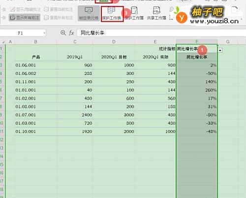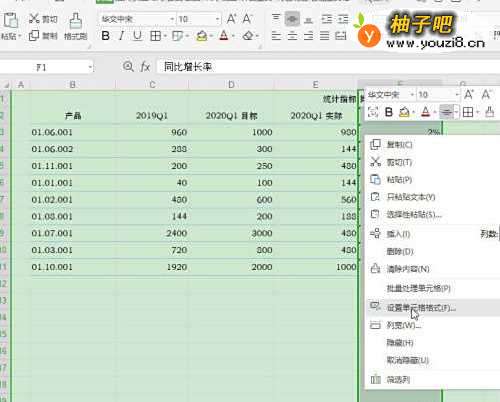 4选择数据列【F】,单击鼠标【右键】,选择【设置单元格格式】,在【保护】选项卡下,勾选【锁定】,点击【确定】;