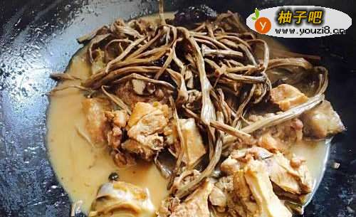 5待鸭腿肉上色之后即可加入冷水,水量以没过鸭肉为准。开大火烧开之后,倒入洗干净的茶树菇,大火煮5分钟。