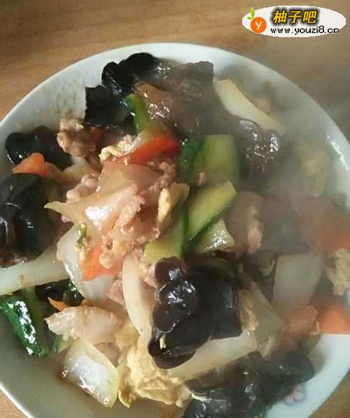 5将肉炒至八成熟后,将胡萝卜黄瓜洋葱放入翻炒,加入木耳黄花菜再次翻炒,接近成熟后放入鸡蛋翻炒。