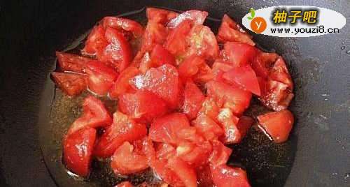 4再次,倒入西红柿小块,炒一会,炸出西红柿汁,然后倒入土豆丝,进行小火翻炒。