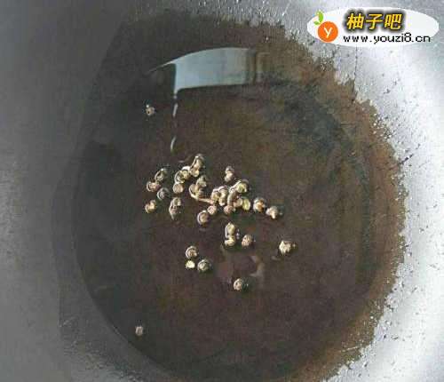3其次,在锅里倒入适量的菜籽油,加热后,倒入生姜片,花椒等,爆炒小会儿。
