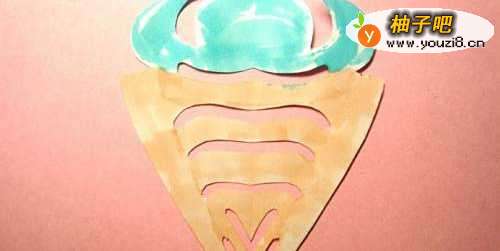 6最后,用浅橙色的马克笔,在剪出的好吃的冰淇淋图形上,涂颜色,注意颜色要涂均匀,并用浅蓝色的马克笔给好吃的冰淇淋的前面图形涂上颜色,这样一个好吃的冰淇淋剪纸手工就制作好了,如下图所示。