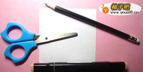 准备好,制作好吃的冰淇淋儿童剪纸手工的材料和工具,有白纸、正方形卡纸、马克笔、铅笔,剪刀,如下图所示。