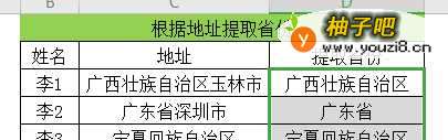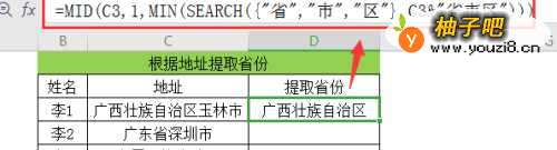 点击D3单元格,输入:=MID(C3,1,MIN(SEARCH({"省","市","区"},C3&"省市区"))),按回车键结束
