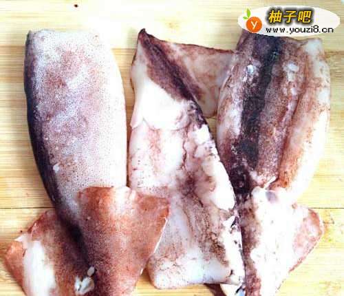 2把鱿鱼去掉内脏,切成段备用。
