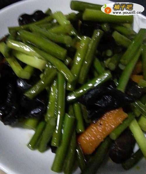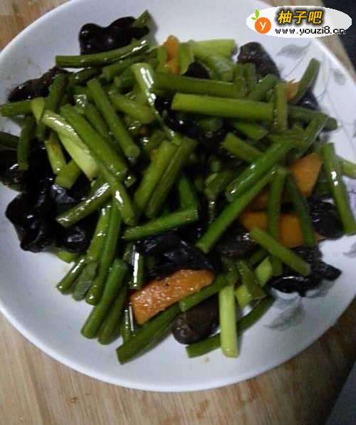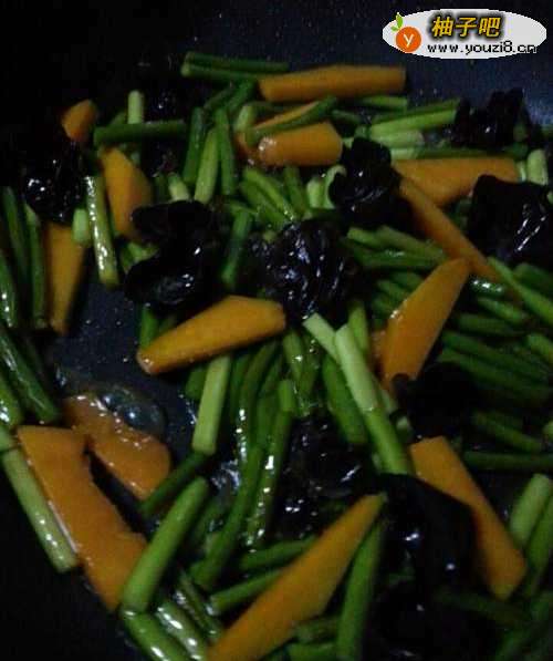 5将焯过水的木耳放入锅中翻炒,锅中加入一勺水