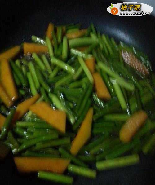 4蒜薹变成鲜绿色后,加入南瓜条翻炒