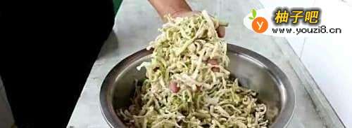 5将晒好的萝卜条放在盆中,加入热水烫一下,(因为放在外面晒容易有灰尘及杂质,用热水烫下会让萝卜条吸水膨胀一点,吃起来更脆)