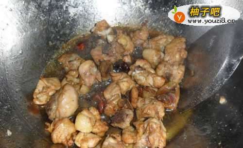 5(5)入水淹至鸡肉九分之一,入板栗,生抽。盖上锅,炖至鸡肉,板栗熟透即可(推荐使用高压锅,高压锅味道压出来比较有酱香)。
