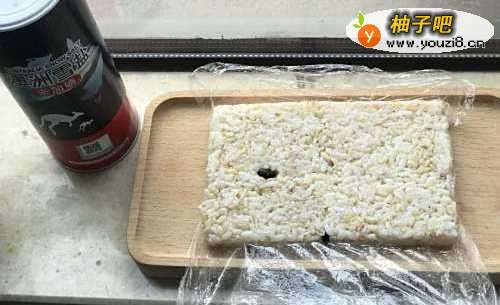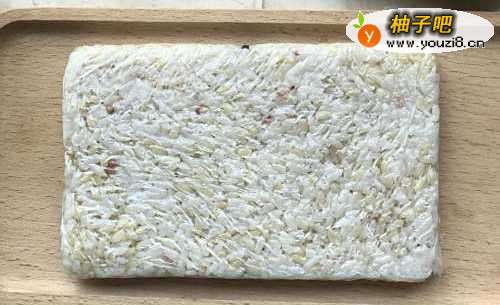 家里正好有没吃完的大米糙米饭,这时候不用放调料,直接用保鲜膜包好整出薄薄的方形,压紧。保持会儿,方便定型!