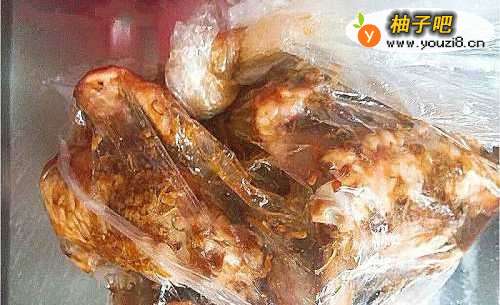2鸡翅装放入碗里,加入腌料拌匀后,一同倒入保鲜袋腌约30分钟。