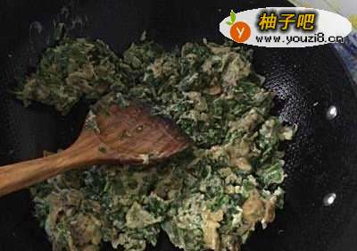 5开锅加油,食用油可多放入一些,以免鸡蛋发糊。待油温升高后,倒入香椿芽。