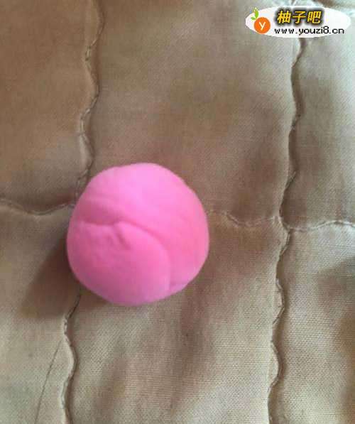 2在拿出浅粉色揉成一个圆形,粘到上面。在拿出浅粉色揉成两个月牙形粘到下面。