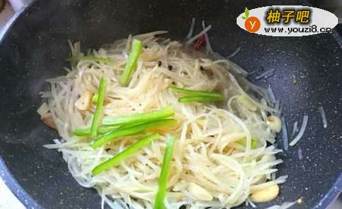 6继续翻炒两下,加入食用盐1勺,翻炒均匀,最后加入青椒丝。