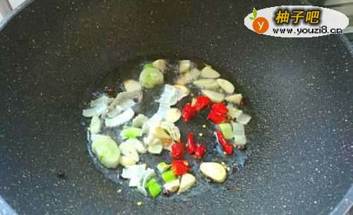 4锅烧热倒入适量的食用油,放入几颗花椒,小火炒出香味,然后把葱花、蒜片、干辣椒,放入锅中煸炒出香味。
