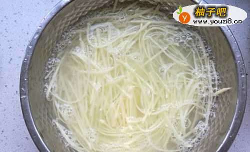 2盆子里放清水,把切好的土豆丝放在清水中浸泡10分钟。