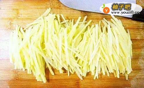 把土豆去皮,切成丝。不会切丝的朋友,可以借助工具算成丝。