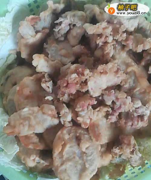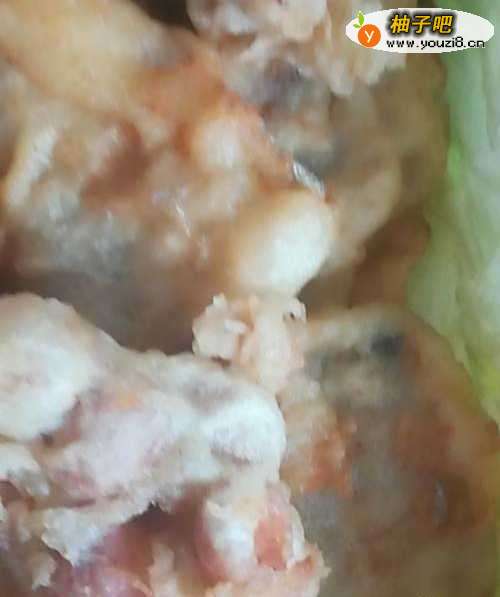 3第三,把白菜叶子铺在框子底部,再铺到四周。当然,直接一次铺好不容易,可以一边码放炸货一边铺菜叶子。