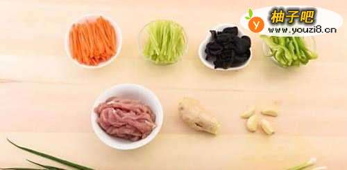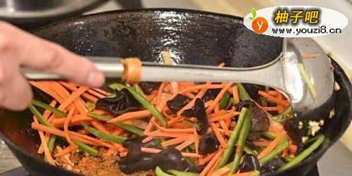 3下入青椒丝、胡萝卜丝、冬笋丝、木耳煸炒至原料断生。