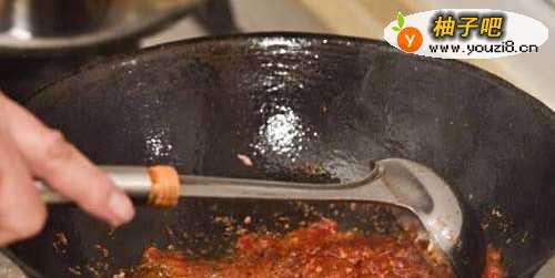 2锅留少量油烧热,下葱、姜、蒜末、豆瓣酱小火煸至油红酱酥。