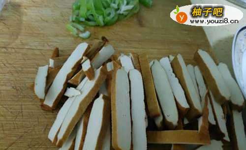 买来的豆干切成均匀的小长条,猪肉切小块准备好。