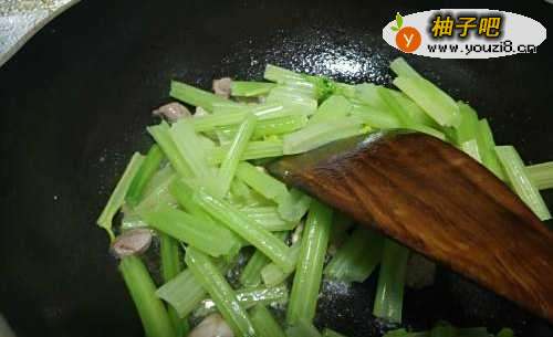 4肉差不多7分熟加焯水的芹菜段,翻炒1分钟。