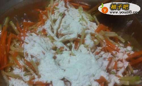 4盆中加入适量的面粉,并搅拌均匀;然后加入适量的五香粉,搅拌均匀;最后在加入少量的淀粉,搅拌均匀。