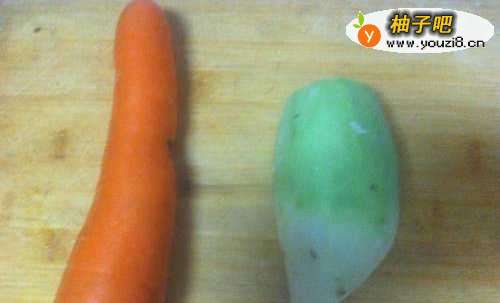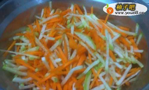 2白萝卜和胡萝卜分别切成细丝,放入盆中,用手搅拌,使两种萝卜混合均匀。