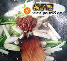 7锅里放油,放入蒜苗,葱姜蒜,豆瓣酱炒香