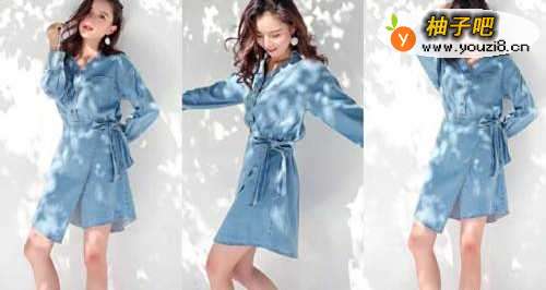 水洗蓝色牛仔连衣裙搭配小白鞋,非常充满青春张力的搭配,给人一种非常小清新的感觉,同时又很有灵动性,给人一种很舒服的视觉感。