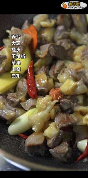 5再按照屏幕上的比例倒入香料,炒出香味,加糖色翻炒着色