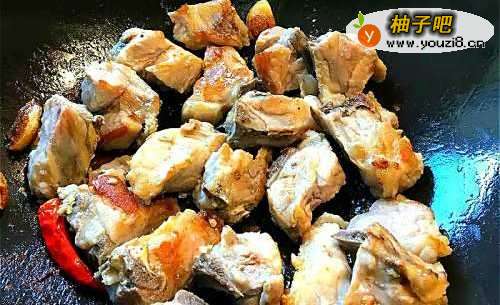 排骨洗净沥干,油锅热后,放入蒜瓣、排骨、辣椒一起炒至排骨呈黄色。