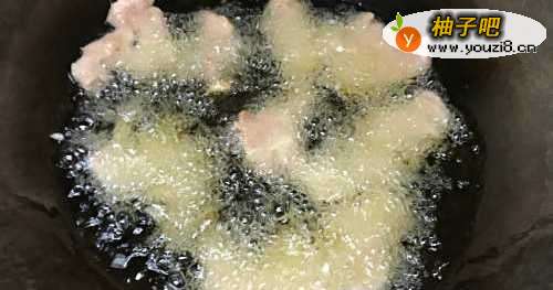 5锅倒入油油温至六七分的时候,摊开肉片放入慢慢炸熟。